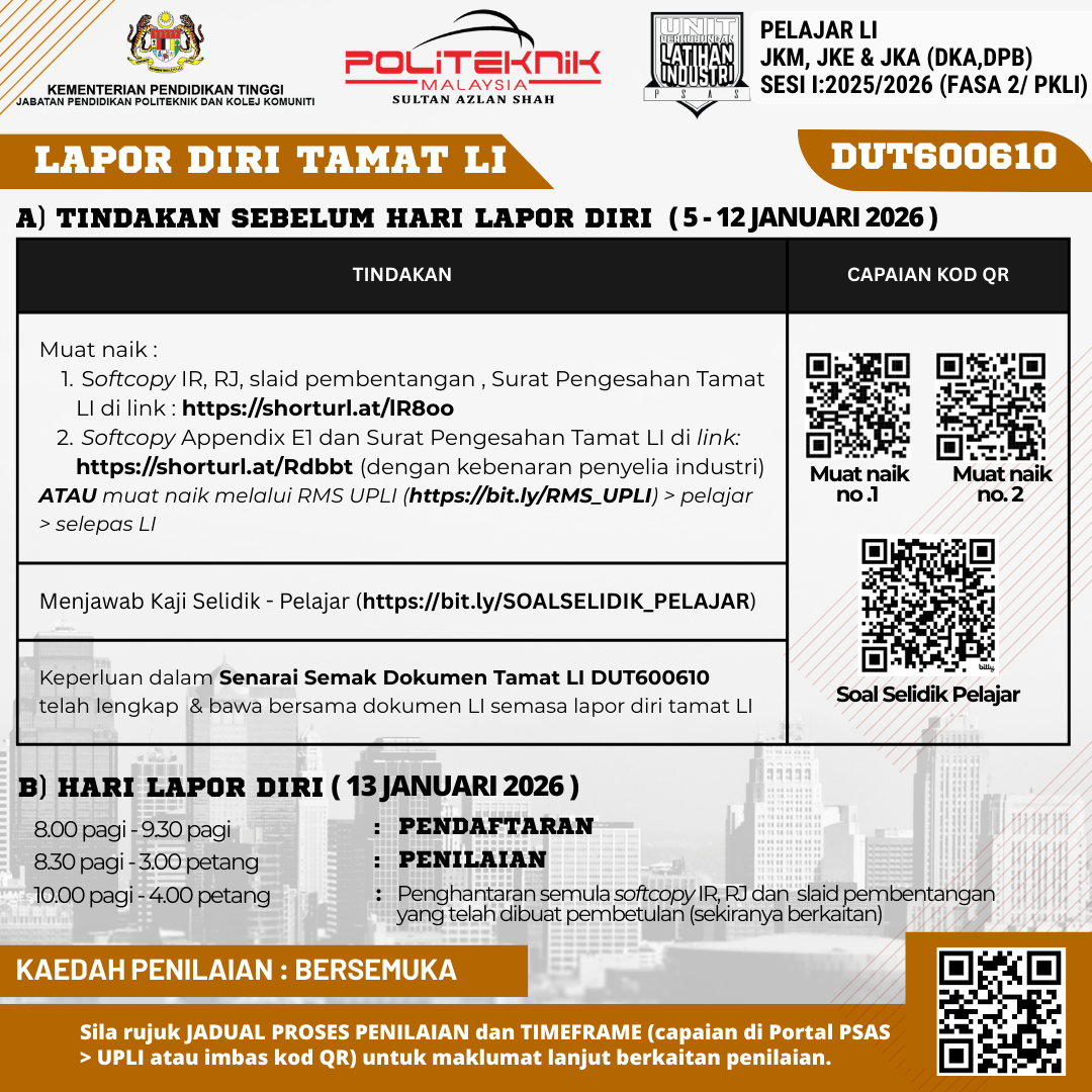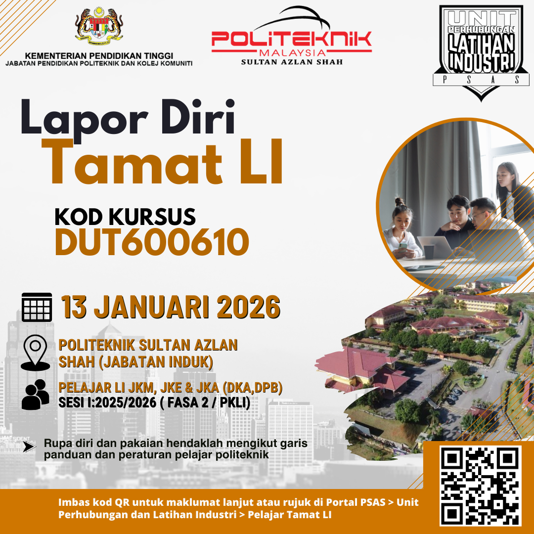 TAKLIMAT 1 : PENGENALAN LI & SESI BERSAMA INDUSTRI TARIKH: 27 OGOS 2025 ( RABU)MASA: 8.30 AM - 1.00 PMLOKASI: DEWAN MUALLIM, PSASPELAJAR:...